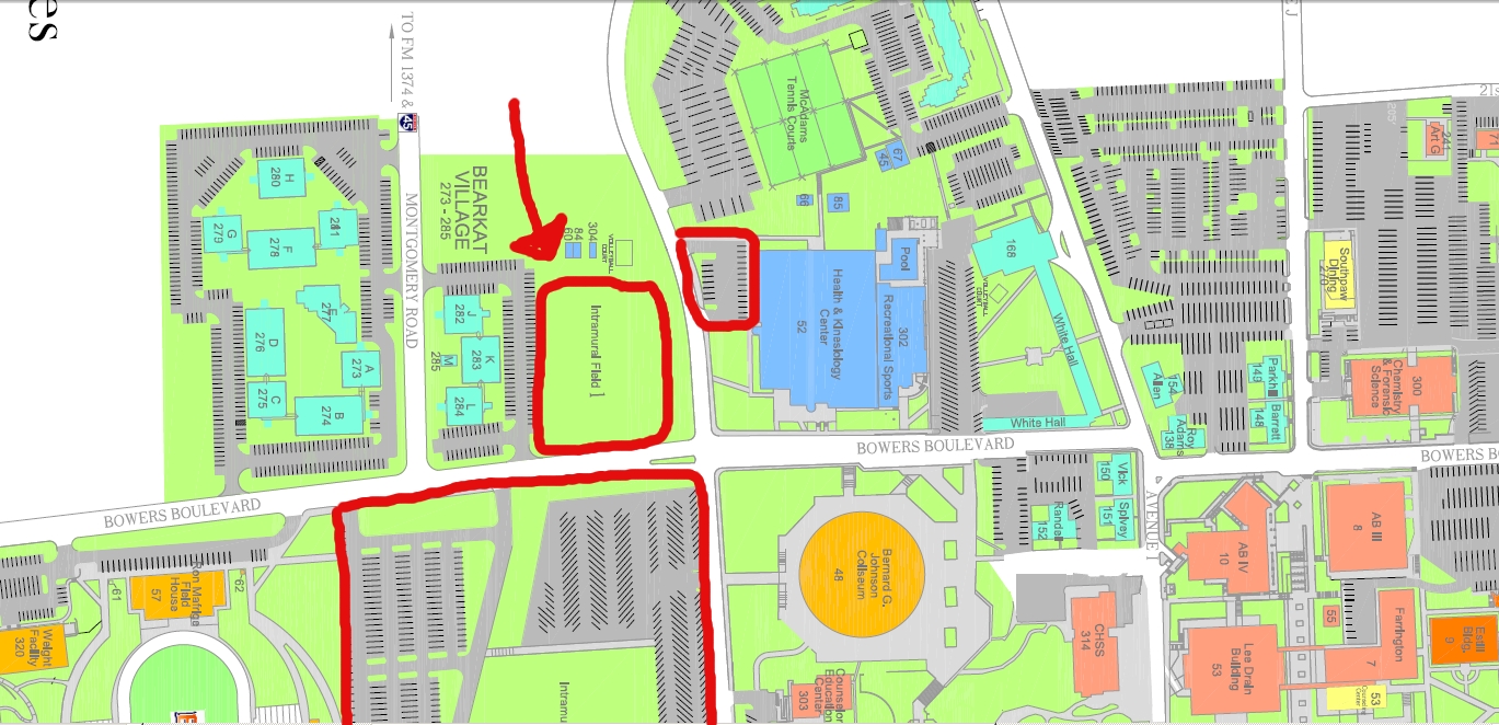 Intramural field 1 is located across the street from the Health and Kineseology Center(gym) and the Johnson Coliseum. I have edited the attached campus map to show where IF1 is and where we will be allowed to park. I'm afraid there are no very good places for handicapped parking, in my opinion the best place is to park across the street in the bigger parking lot and cross the street. Parking in the smaller lot means a bit of an uphill climb. If anyone needs more specific directions reply to this and I will do my best; direction aren't my forte!